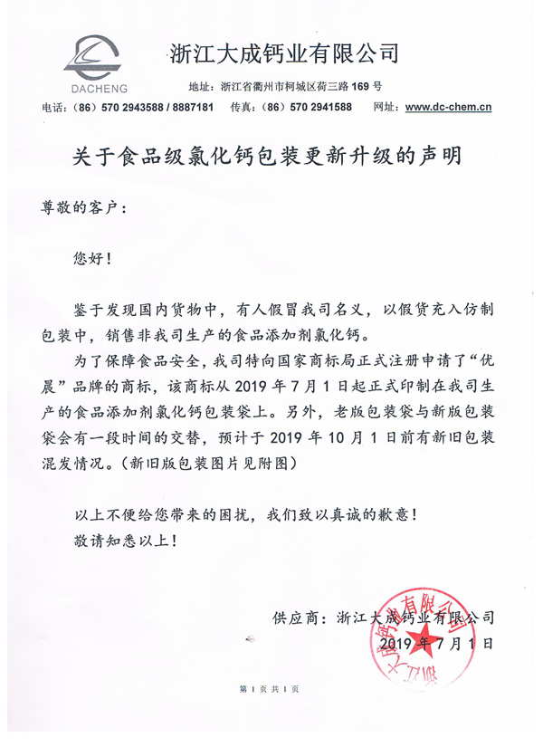 Statement on the update and upgrade of food-grade calcium chloride packaging